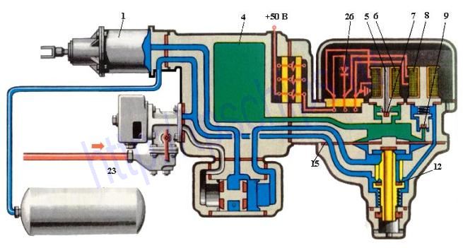 Число кратковременных возбуждений катушки вентиля 8 определяет число ступеней торможения, а их длительность — величину давления ступени (минимальная ступень 0,2 кгс/см2).